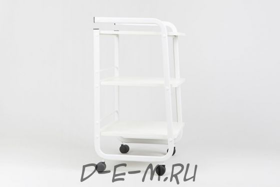 - Конструкция изготовлена из прочного металла, а полки в количестве трех штук - из практичного ЛДСП. Изделие выполнено в белом цвете, который подойдет к любому интерьеру.